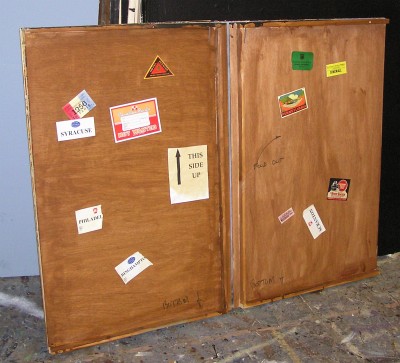 One hinge. The strips of cloth are 3" wide, glued on with cabinet-makers (yellow) glue, and clamped while the glue dried. The hinges have stood up to 10 performances and several rehearsals and a preview performance with no apparent degradation. Some of the panels are stiffened with strips of 5/8" x 5/8" pine, glued along the edge. |