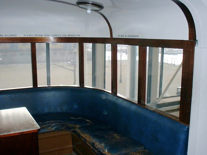 ![]() Interior, upstairs, end of car (Mumbles tram). The windws on our left are actually the front of the tram, and those on our right are the right-hand (landward) side of the tram. Again the "box" coerving the lower stairs is visible.: photo DSCF0170, 11/07/2000 This page last updated on 01/21/2012 16:28:44 |