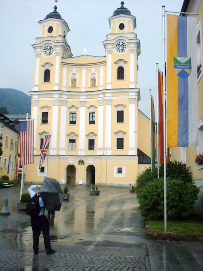 Mondsee Cathedral in rain. This was used in The SOund of Music as the church where Maria & von Trapp married.