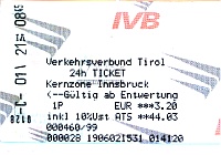 Stubaitalbahn to FulpmesOn returning to Jenbach we went back to Innsbruck and were toying with the idea of going to Igls or such when a tram-train rolled in past the tram-stop in front of the station. Then came a tram with STB (Stubaitalbahn: up the Stubai valley) as its destination. So we boarded, found that our Innsbruck tickets were not valid, bought day passes for the STB, and sat back and enjoyed the ride, along the regular tram route through town. At the STB's own station on the edge of town the line diverges from the city tram-tracks through a barrier and immediately starts climbing up. It winds and turns and zig-zags and goes through tunnels to climb to 936 metres above sea level at Fulpmes. There are walking trails and lakes along the route. The line terminates at a proper station with Bahnhof cafe, where I got a small bottle of soda-wassser at an exhorbitant price, but it was worth it. The cafe tables were crowded with older people who had been enjoying the beer, I think, and the company. We boarded the returning tram, and it was just as well that we did, because not only did that group board, but the tram-train - the "Nostalgiebahn" oldtimer train - one motor car and two trailers - and, in town, a van for bicycles - rolled in, and its passengers also boarded our vehicle. The car was loaded. On the way down, local people boarding were surprised - and I think annoyed - to find it so full. The group were laughing and joking. One of them got into the little cashier-cubicle that used to be used for fare collection by the conductor, and asked each entering passenger for his/her pass - and then revealed the joke. All were laughing - except the passengers who had been fooled. We got off in MuseumStrasse, to get no. 3 back to hotel. However, we got off before the hotel, to have a look at IKEA. In Canada, Ikea no longer sells fabrics, but Eufron wanted to find out whether Ikea/Austria still sold them. Looking out of the side doors (emergency exit) from Ikea, I could see the rain pouring down - it must have started just after we entered the store. But when we left the store, to catch the next bus to the hotel, we could see that it had apparently rained on one side only of Ikea! The ground on the other side was still dry. We ate in the hotel dining room - schnitzel.