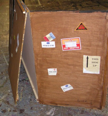 Here is the whole unit folded for transportation into a package 4 ft wide by 3 ft high, less than 1.5" thick. The outside is covered in shipping stickers. |
