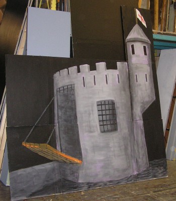 Nearly complete! So far, the castle can be free-standing, since the wings provide stability. All that remains is to swing up the panel on the right of the picture which has the tower and the flag painted on it. | |