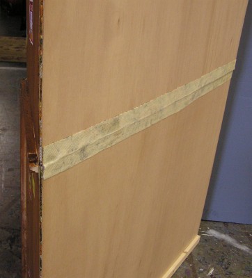 One hinge. The strips of cloth are 3" wide, glued on with cabinet-makers (yellow) glue, and clamped while the glue dried. The hinges have stood up to 10 performances and several rehearsals and a preview performance with no apparent degradation. Some of the panels are stiffened with strips of 5/8" x 5/8" pine, glued along the edge. |