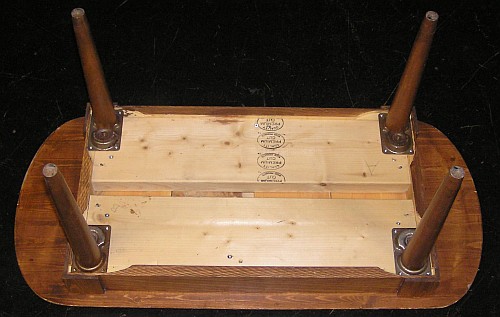 From above or the side, the table looks normal. But the centre is made of two layers of 2"x8" spruce, a fairly dense wood, to give it mass. The corners are actually shims glued on. |