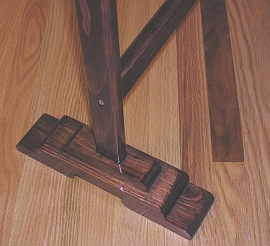 The feet are built up of 1"x3" pine, screwed and glued for solidity. I used the router to round off the edges of the uprights, and the ends of the feet. The grain shows up rather strongly, but from the audience, this does not matter. |