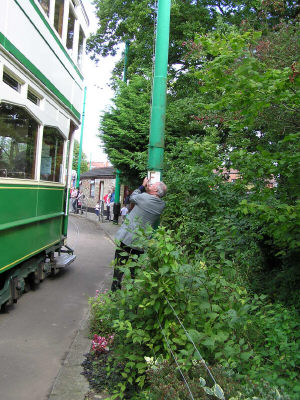 Tram conductor pulling handle to route the trolley pole.