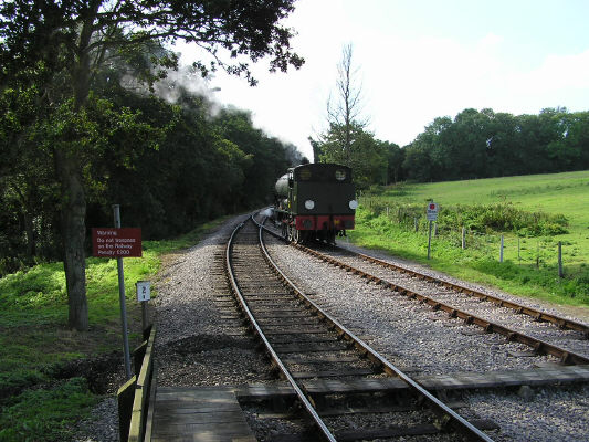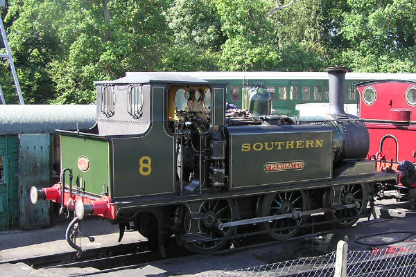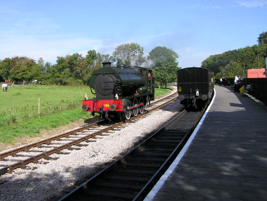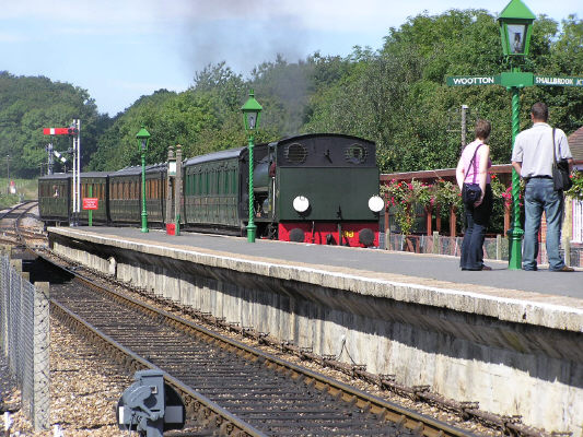 Steam train at Smallbrook Junction (Island Line electric train platform is to the right). The train has just arrived, so the rear light has not yet been removed.