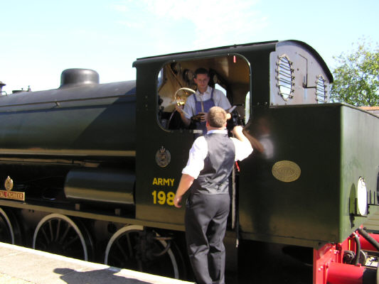 Loco driver holding single-line token on loco 198 at Smallbrook Junction