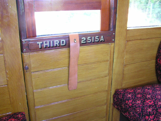 Detail of passenger car: leather strap for raising & lowering carriage window on IOW Steam Railway