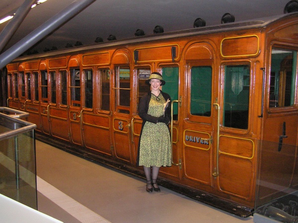 London's Transport museum: Guide in 1932 costume in front of Metropolitan Rlwy