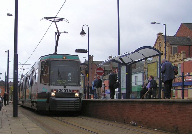 The Manchester Metrolink system uses high-level platforms, as shown at Eccles Photo P1010029:Date 11/2/2009