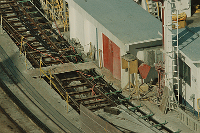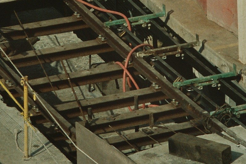with their cross-ties. On the right, the green bars appear to be temporary supports