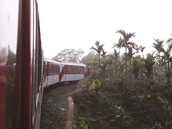 Every guide-book to Taiwan seems to mention the mountain resort of Alishan. Neither our friends nor relations had been there, though they’d heard about it. When I realized that a narrow-gauge railway was the way to get there, we just had to go. The Alishan Forest Railway was built by the Japanese during the 50 years that they occupied Formosa (Taiwan). It was originally intended as a logging road, to get timber out of otherwise inaccessible areas in the mountainous interior of the island. Nowadays, there is also a highway to Alishan, but it's white-knuckle driving. There are five classes of main-line trains in Taiwan, from air-conditioned expresses to breezy local trains. While the roads and streets of Taiwan have an American flavour (style and position of traffic lights and direction signs), rail transport is more European or British. The trains keep to the left, there are high level platforms, and the term “railway” is used in English signs, rather than “rail-road”. The first thing then was to reserve seats on the long-distance train, which we did with the help of an English-speaking person who saw us struggling. Then, early on Monday Feb 5 we took a taxi to Taipei Main railway station and managed at the (Chinese-speaking) enquiry counter to find what time we were to arrive at Chiayi, the transfer point to the narrow-gauge railway, which is about half-way down the left-hand side of Taiwan. We fumbled our way down to the platform underground, and train 1017 arrived on time. The platform has glass disks embedded in it between the yellow line and the platform edge, and when a train approaches, these flash red! When we boarded the train, we found two girls in our reserved seats, but they moved out when they saw us coming. The train starts in Keelung, so people without reservations take any seat and hope that those with reservations do not show up. Turned out that the train was fairly crowded. Three boys stowed their gear on the rack above us, then went and stood or sat in the vestibule - with the train door held open! We had expected that they were only going to the suburbs but they went as far as we did. It was a smooth uneventful trip down the electrified West Coast Main Line: we seemed forever to be in Taipei suburbs until we branched to the mountain route via Taichung. We had elected to take the faster train to Chiayi, even though the next, slower train should have got there in time. Just as well we did, because the next train was delayed and we would not have made the connection. At Chiayi, three girls who had been awaiting that train to go to school got into conversation with us, since we were the first native English speakers they had ever talked to. They were still there when we left! When we tried to book seats on the Alishan Forest Railway (at Chiayi) we had a nasty shock. No seats left! (the ticket clerk told us this in English). Then it dawned on me: on the previous Friday, when we had tried to book through from Taipei to Alishan, the ticket clerk in Taipei told us he could only reserve as far as Chiay. I’d assumed it was because the Alishan line was a separate railway, but no, he must have meant that the train had no spare seats. Anyway, the woman behind us in the line at Chiayi also was out of luck. Then my wife had an idea: could we stand on the train to Alishan? (As youngsters, we used to stand mosts of the way on the London to South Wales train). No problem! the clerk issued us two tickets right away, unreserved. The other woman was furious! She probably thought that we foreigners could get seats when she could not. She tore into the ticket clerk but didn’t get much satisfaction. I suppose that his response was “If you too want to stand like those foreigners, I’ll sell you a ticket, but don’t complain to me about not having seats!”. Once we boarded the narrow-gauge train and hung up our coats, we were not allowed to stand. A family party insisted on doubling up with their children so that we could sit. We tried to demur, and indeed throughout the trip we tried to stand, but we simply were not allowed to. The train loaded with more and more teenagers. Then we realized that there was a lesson here. We had assumed that as Alishan is set up for the numbers of people going there on summer weekends, there would be no problem on a winter weekday. Correct, but . . . do NOT travel on the Monday of one of the weeks preceding Chinese (Lunar) New Year. It’s the school break! and all these teens race to Alishan like Canadian teens racing to Florida on their school break. The aisle of our car was crowded with girls. Another thing we learned was: don’t get on an excursion train without a visible bag of food. The family was sure these occidentals were going to starve on the trip, and kept plying us with fruit: they just would not take “no” or appropriate gestures for an an answer. All we could do was say “shi-shie” (“thank you”) gracefully. The girls got into the act too, and insisted we try out each of the snacks and candies that they had. They wanted to get into conversation, so with some words of English and fewer words of Chinese (and even Japanese) we had a great trip. The train starts at 30m above sea level at Chiayi, and the weather is hot. The general climate is tropical: you see palms, coconuts, bananas, oranges, etc. growing. In 72km it ascends about 2200m, and the weather is chilly, in fact cold. Near the top there are tea plantations, and around Alishan the trees are all conifers: makes a Canadian feel right at home. It’s an average gradient of 1 in 36, which is amazing for a railway. But the low-slung diesel locomotives each push four passenger cars up the mountain at a steady speed. The leading two axles are coupled together, and the trailing two axles are coupled together: but the leading and trailing are not coupled. This gives a curious optical effect as you look at the side of the moving train, as the front wheels and trailing whee