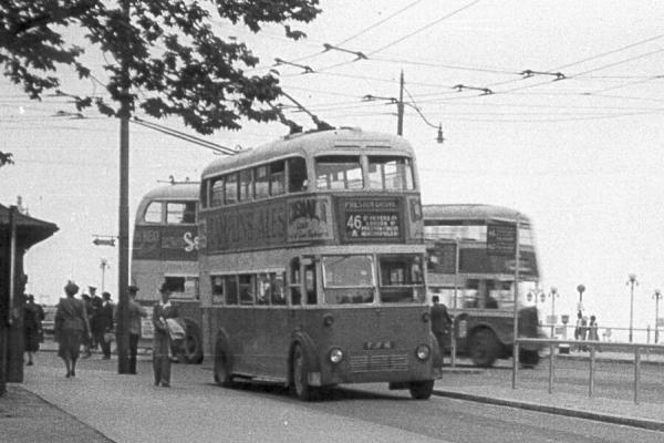 Brighton trolleybus [29] at the Aquarium, Old Steine terminus. This was the terminus for most of Brighton's trolleybus routes. The wooden building on the left was a relic from tramway days and was used as a staff rest room and passenger shelter. The trolleybus was one of the original AEC661T trolleybuses with Weymann H54R bodywork supplied to Brighton Corporation Transport new in 1939. It appears to be number 16