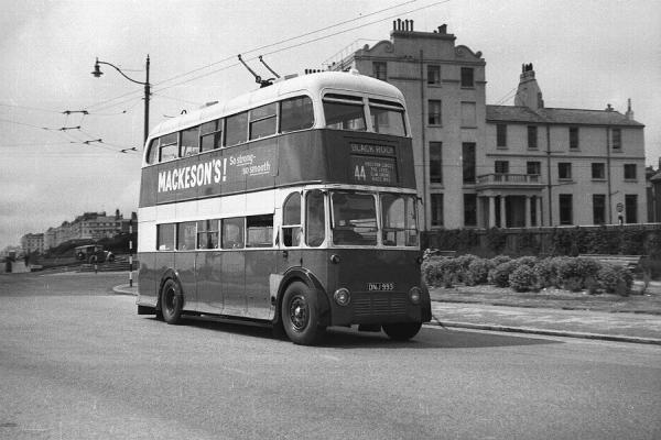 Brighton trolleybus DNJ 993 [29] on the anticlockwise terminal loop of service 44 at Black Rock - the only place where the trolleybuses travelled along the seafront...for about 30 yards or so. At one time the trolleybuses terminated on the seafront road, Marine Drive, but later just around the corner in Arundel Street. The vehicle has just pulled out of Arundel Road and is a BUT9611T trolleybus with Weymann H56R bodywork supplied new to Brighton, Hove and District Omnibus Company early in 1948. DNJ 993 (fleet number 6392) passed to Bournemouth Corporation Transport in April, 1959, was renumbered 294 and remained in service until August, 1965.