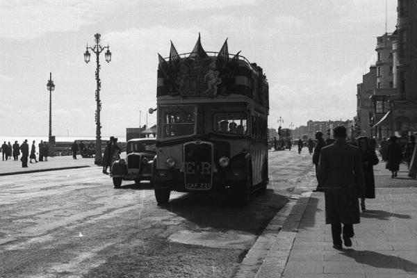 Open-top Brighton bus decorated for coronation, at seafront, [29] in King's Road, heading east towards Rottingdean. It is in Brighton, not far from the Brighton / Hove boundary - where the ornate street lights finish in the background - close to the West Pier, the remains of which were in a fire in 2003.