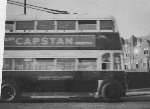 [29] Brighton, Hove and District AEC661T trolleybus similar to Corporation FUF 16 (see n05_5_2). It was stored during World War 2 and entered service in 1946. I think (from the advertisement) that it is CPM997 (fleet number 6347) and is seen turning from Marine Drive into Arundel Street on Service 44.