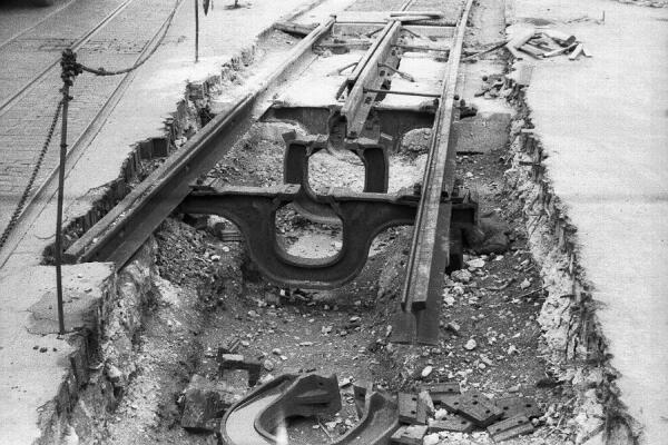 These tracks were laid on the South Bank of the Thames, in preparation for the Festival of Britain of 1951. As very few visitors were expected to use their own cars to attend, public transport was improved before the exhibition opened. Laying new tram routes was made easier because not all the bomb damage of WWII had been repaired at that time: new streets could be driven through bomb sites. Apart from the other road vehicles in the photos, any of these pictures might have come from the 1899 issue of Cassier's Magazine, which had an article about the Metropolitan Street Railway of New York. Conduit track technology did not seem to have advanced in those 50 years.