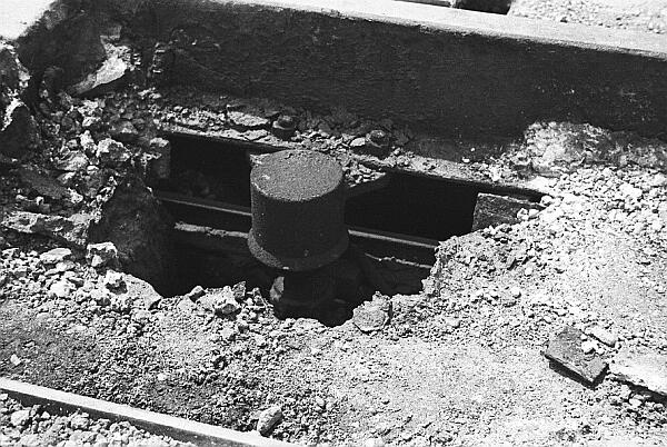 The tracks of the turnout are supported on concrete pillars: some can be seen on the right of the photo. The power rails have to be switched as well as the running rails: I don't have any photos of this (see the London Transport Museum for a working model) but you can see one of the double-yokes (NOT double-yolks) used where the tracks deviate.