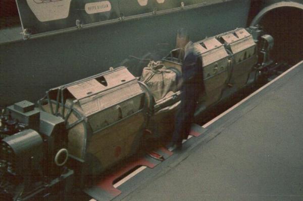 Valve-gear of new steam loco, "William Shakespeare" at Festival of Briatin, 1951