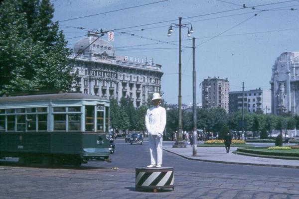 Milan tram with traffic control policeman (the "Vigile") at pza della Repubblica