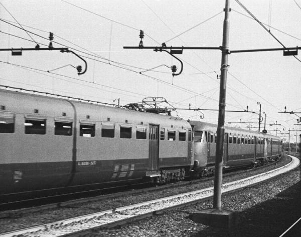 Electric loco FS E.428 class on the left : an "100porte" coach in the