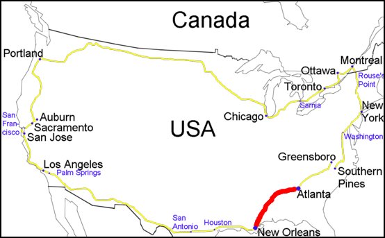 The Crescent (again)The initial route from Atlanta lay almost directly west to Anniston, Alabama. But the track was the most winding that we had so far encountered! it was as bad as that north of Brisbane: and there, the Queensland government was straightening it out - like holding both ends and pulling hard. But for us, the train was quite slow, and wiggled one way and then the other. It rained continuously, but there is nowhere better to be on a rainy day than in a warm, dry train, watching the soggy countryside go by. At one point there was an announcement: "We have crossed the state line into Alabama, we are now in the Central time zone. The time is now 10:44 am". In spite of this, our stomachs were still on Atlanta time, so we had an early lunch of the baguette, ham and cheese we had bought. The pocket knife that our son Colin had given us years ago, when we'd started travelling, was invaluable. Of course, we couldn't have carried it on board an aircraft. We'd expected to see agriculture, possibly cotton growing. but there was no