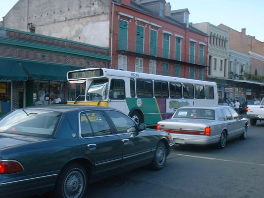 opposite direction. After a very long time, the When the rain had now stopped (once more), we walked up Canal Street and found the Charles Street trolley line. When the green car came, we climbed aboard, the pass giving us an advantage - we could board while lesser mortals were struggling with dollar bills and quarters. The Charles street line gives a magnificent ride through the garden district, seeing the big houses, the two universities side-by-side, and the gardens at the entrance to the zoo. We even saw our driver of the Riverfront car! She took the Charles car to where she had parked her mini-van. At the end of the line, we, and half the passengers, walked over to the next car to leave and re-boarded for the journey back to town. At the corner of Charles St. we got off and went to "The Trolley Café" but they only served full meals. They did direct us to the "CC" café where we got our coffee and snack. Then we got the next car back to town. Walked along Bourbon Street (dirty and smelly) to Conti, and to our hotel. Sat in the delightful courtyard at the back of the hotel, and wished that the bar still operated so that we could sip a drink in the courtyard. Took stock, decided on what tours to try for, and went in search of supper. Looked at the dining room of the "sister" hotel, the St. Louis, decided it would be good for breakfast but not for dinner. Re-stocked on cookies at the drugstore on Royal St., and had fish and chips at TGIF. Neither of us could finish! We were full. Monday morning: arose a little late and went
