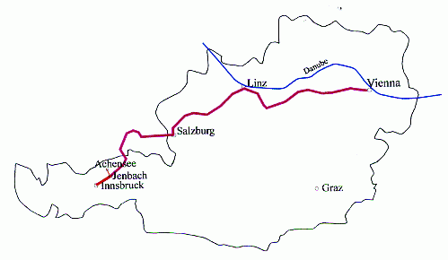 The little steam locomotive huffed and chuffed up the rack rails to the summit, then the engine ran around to the other end of the train so it was pulling not pushing, and we continued on to the boat pier on non-rack track. There are two "steamers" on the lake. We elected to go on the boat that was at the pier though it was smaller and had no lunch facility. We took seats on the port side, in the shade of the upper deck, and had a wonderful boat ride to the lake head. (Achenseehof???) We decided to stay on board and go right back rather than alighting and waiting for the next boat, as there was nowhere in the shade near the pier. We did switch to the starboard side of the boat. Arriving back at the pier where we started off, I went in to the snack bar and asked whether they did wine spritzer. "Yes" was the answer, so I asked for two, and was asked "Red or white wine" so we had white. Then we had ein strudel mit zwei gabeln (two forks). The train meanwhile had chuffed in, and we boarded an open coach, which promptly filled up with people from the tour we'd encountered on our trip up the lake. One couple was from Anglsey who told us about their train trip booked through www.greatrail.com . When we got back to Jenbach, the Zillertal train, on the other side of the station, was getting ready to depart. This also had a narrow-gauge locomotive, but it was a large, heavy-duty machine.