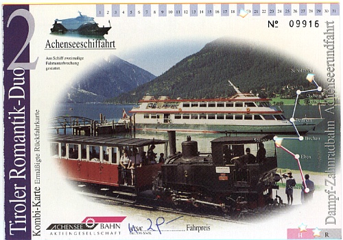 Achensee & AchenseebahnBreakfasted at our hotel in a pleasant room, with breads, meats, cheese, cereals, juices, coffee. To the Hbf by bus and bus, booked seats to Jenbach (with our Vorteils cards), and caught an earlier train than we expected. However, it was 10 min late leaving, Jenbach next stop. On the way, we ate up the strawberries that Eufron had bought in the store. I laid a newspaper across my lap to absorb the juice. Across the aisle was a small boy with (I think) his grandfather, also going to Jenbach. With the grandafather's approval, Eufron offered him a strawberry. I leaned forward to give it to him, the newspaper tipped up, and the juice that had NOT been absorbed by the shiny advertising pages poured off into my bag, falling on my Tilley hat in the bag! I had pink stains from then on.