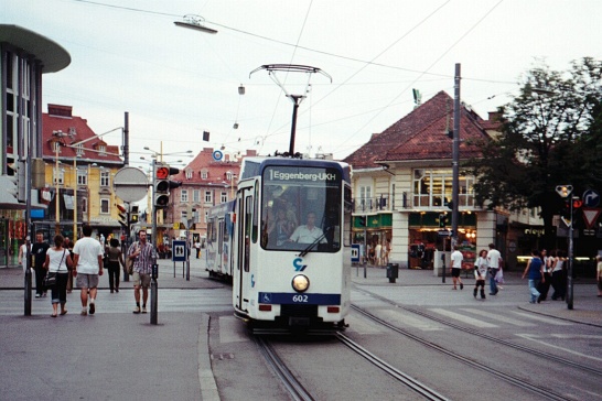 Tram near Jakominiplatz, Graz. note the interlaced (4-rail) track: the route selection hs already taken place, but both tram routes run on same track.