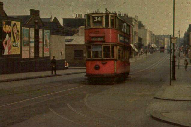 On the other hand, the complete track consisting of running rails, slot beams, and conductor rails, was very rigid. In at least one instance, this was a useful feature: a tug-boat managed to ram a string of barges into Battersea Bridge, sever ly damaging it. In fact, the only thing stopping the span from falling in the river was the dual-track tramway. The bridge was at once closed to all traffic, and trams reversed just south of the bridge. The tram in this picture is about to use the crossover (just visible beyond it) to reverse. The disconnected track in the foreground ran through a large wooden gate into a yard on the river bank. Originally, this was a siding for a permanent-way maintenance yard that was formerly on that site, and the crossover was used in conjunction with the siding. The picture was taken on Dufaycolor film. This was an early colour process using the additive principle, where pictures were built up of dots of primary colours.
