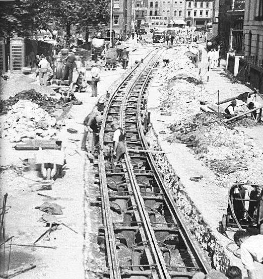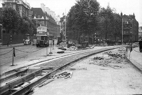 These tracks were laid on the South Bank of the Thames, in preparation for the Festival of Britain of 1951. As very few visitors were expected to use their own cars to attend, public transport was improved before the exhibition opened. Laying new tram routes was made easier because not all the bomb damage of WWII had been repaired at that time: new streets could be driven through bomb sites. Apart from the other road vehicles in the photos, any of these pictures might have come from the 1899 issue of Cassier's Magazine, which had an article about the Metropolitan Street Railway of New York. Conduit track technology did not seem to have advanced in those 50 years.