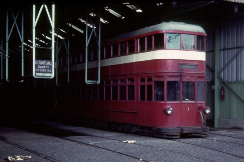 Swansea & Mumbles Railway car no. 1 in shed.: photo C0158, 07/25/1951