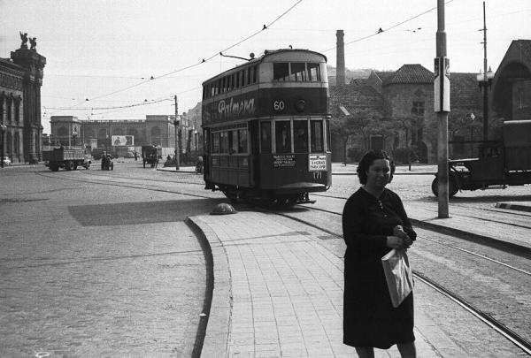 Barcelona: double-deck tram at Atarazanas [2] Atarazanas nowadays known as Drassanes. Car is from first d/d batch 169-193